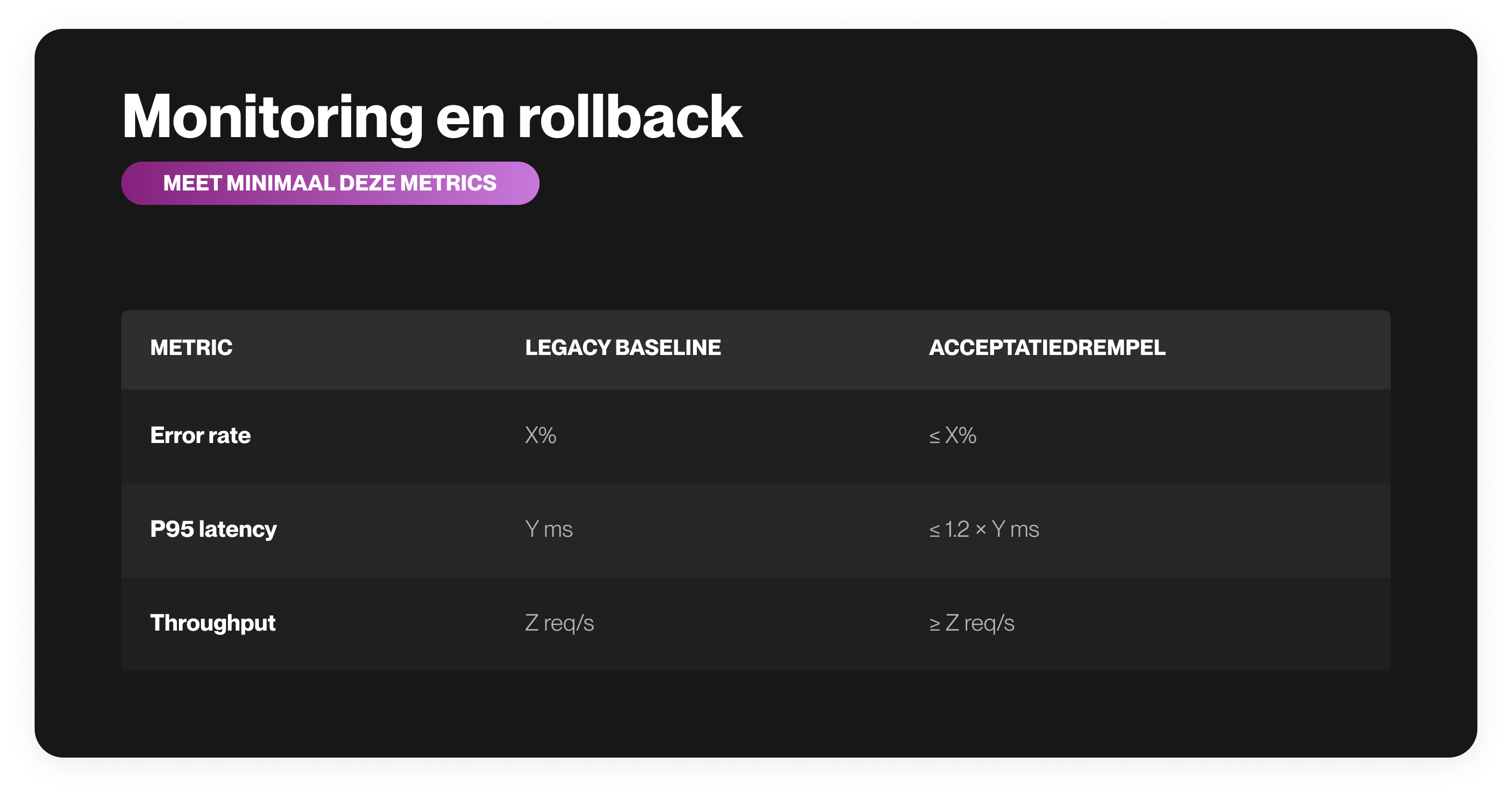 - Error rate >2× baseline gedurende 5 minuten
