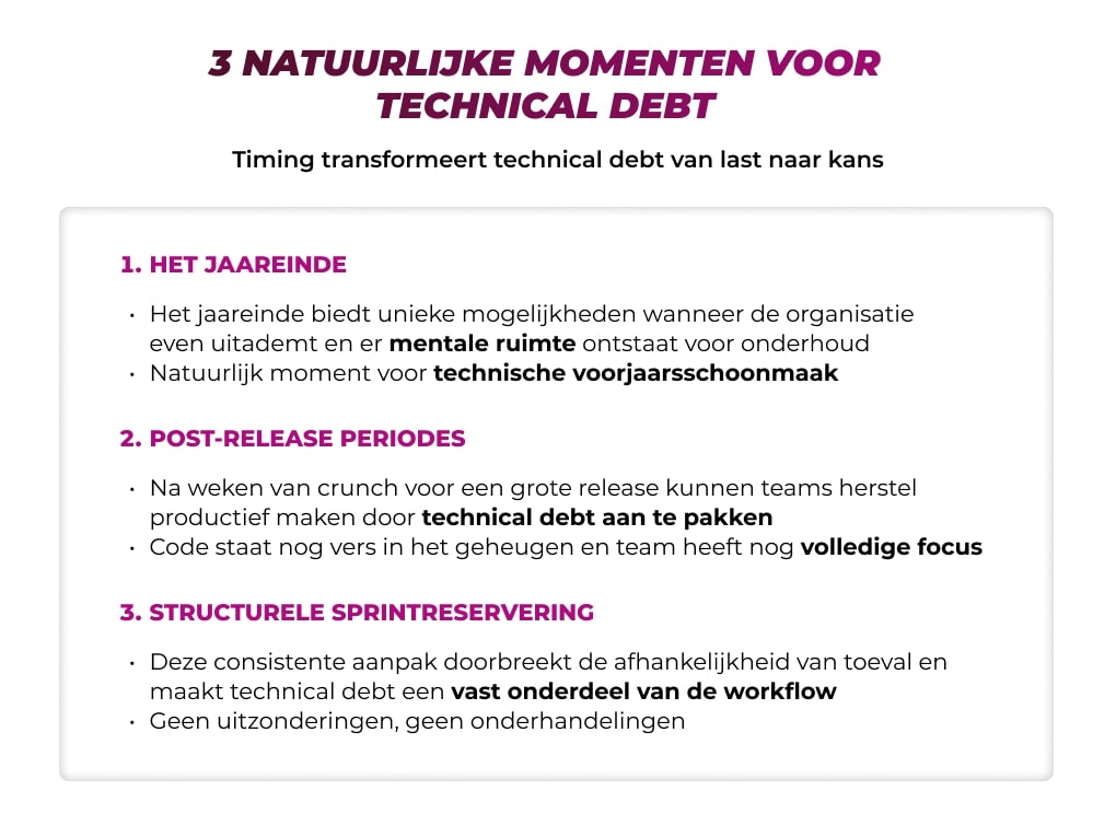 Post-release periodes vormen het tweede strategische moment. Na weken van crunch voor een grote release hebben teams behoefte aan herstel. Deze natuurlijke pauze kan productief gemaakt worden door technical debt aan te pakken. Het team is nog volledig gefocust, de code staat vers in het geheugen en de motivatie om het beter achter te laten is hoog.
