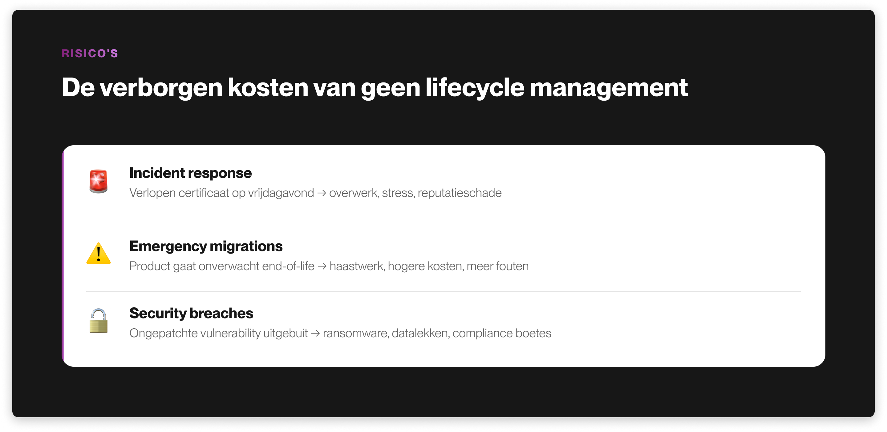 De investering betaalt zich terug in minder incidenten, lagere migratiekosten en een betere security posture. Belangrijker nog: het geeft controle. Je weet wat je hebt, wat het kost, en wanneer je moet handelen.